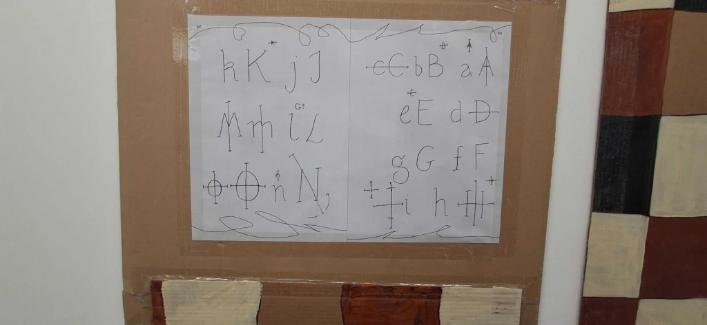 Au fil de son travail, cette adaptation devient matière artistique. Les lignes se déforment, les lettres évoluent, l’encre déborde. Marion Cachon développe une typographie pensée pour les gauchers : en modifiant les gestes, en inversant certaines formes, elle adapte l’écriture au mouvement naturel de la main gauche. Ce qui pourrait apparaître comme une imperfection devient alors une esthétique.
